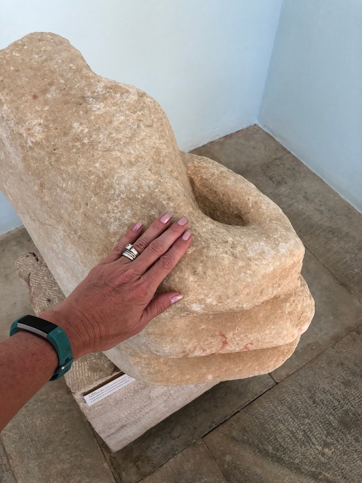 Over my right shoulder (on the left hand side of this picture) is the torso and over my left shoulder (on the right side of the picture) is the pelvis of the Colossus of the Naxians, which was a statue of Apollo which was approximately 9 meters in height, dating back to the early 6th century BC.